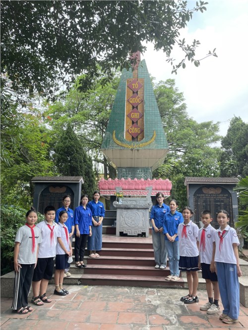 Đoàn Thanh niên và các em học sinh trường Tiểu học Tạ Hoàng Cơ dọn vệ sinh Đài tưởng niệm anh hùng liệt sĩ xã Liên Ninh
